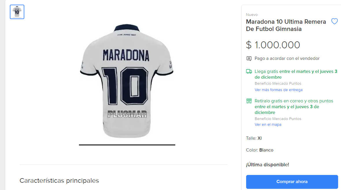 Otro de los productos es una de las remeras que recientemente sacó a la venta Gimnasia, último equipo que tuvo al "10" como DT. Más allá de su desorbitante precio, en los comentarios acusan a su vendedor de "querer hacer negocios" con el reciente fallecido.