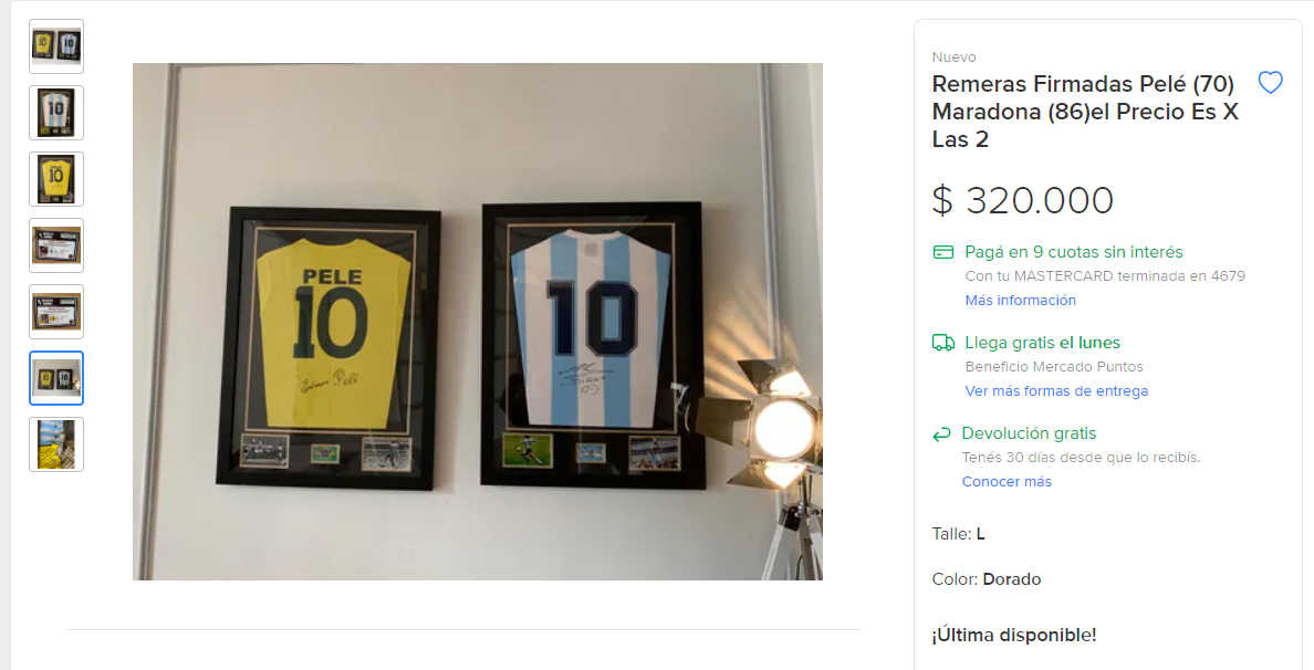 Una de las publicaciones más llamativas (y sin lugar a duda, de las más "preciadas) es una camiseta firmada por Maradona. El autor de la publicación pide 15 millones de pesos o u$s100.000 para desprenderse de esta reliquia.