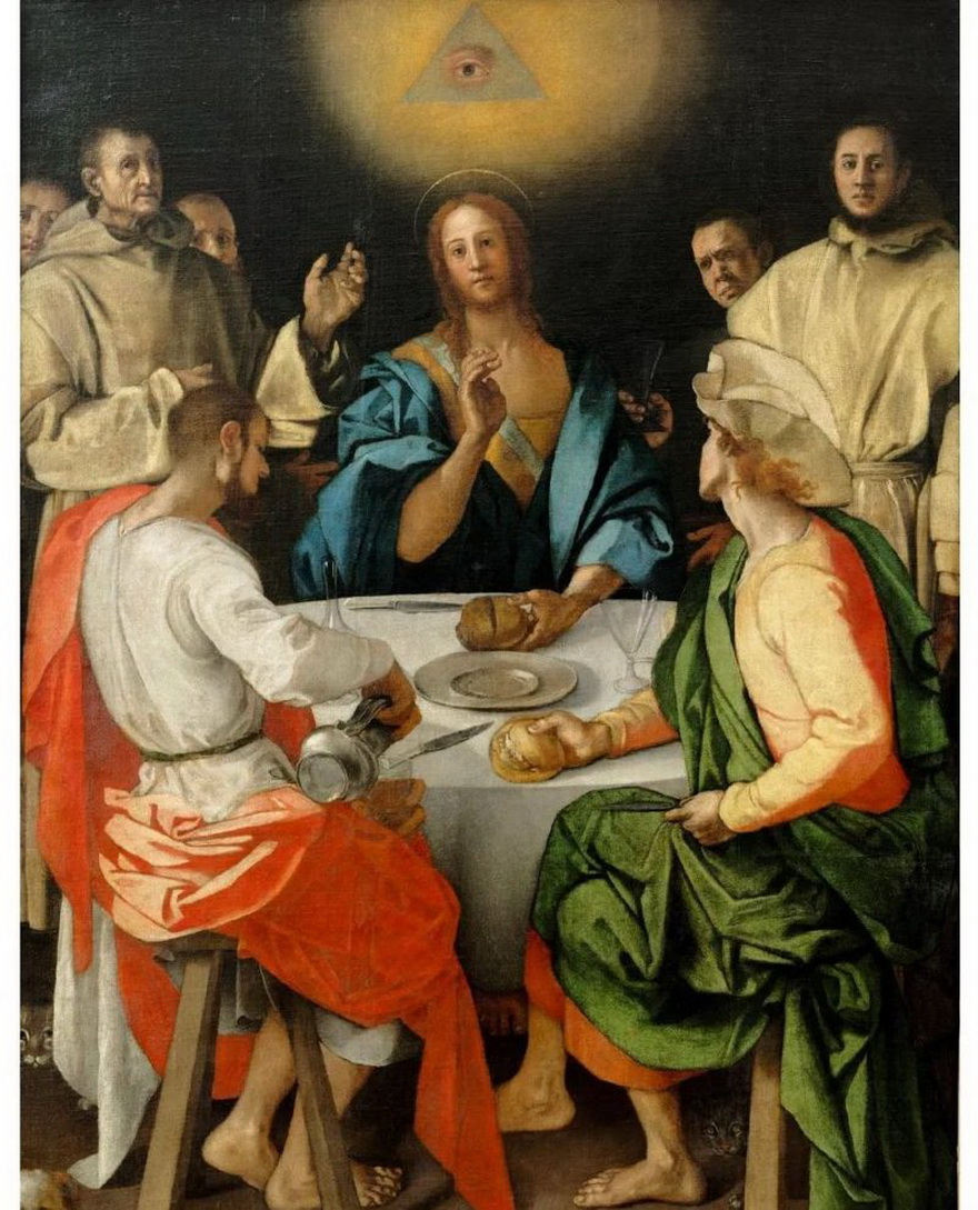 Un ejemplo temprano es el cuadro "Cena en Emaús", pintado por el renacentista Portormo en 1525, aunque el símbolo del ojo fue añadido más tarde, quizás en el siglo XVII.