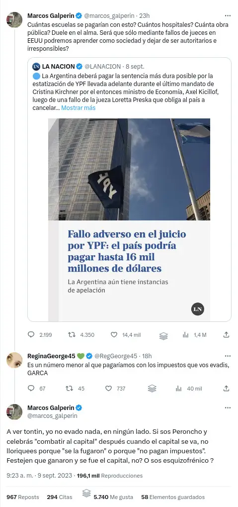 "¿Cuántas escuelas se pagarían con esto? ¿Cuántos hospitales? ¿Cuánta obra pública? Duele en el alma. ¿Será que solo mediante fallos de jueces en EE.UU. podremos aprender como sociedad y dejar de ser autoritarios e irresponsables?", publicó Galperin en su cuenta de X (Twitter).