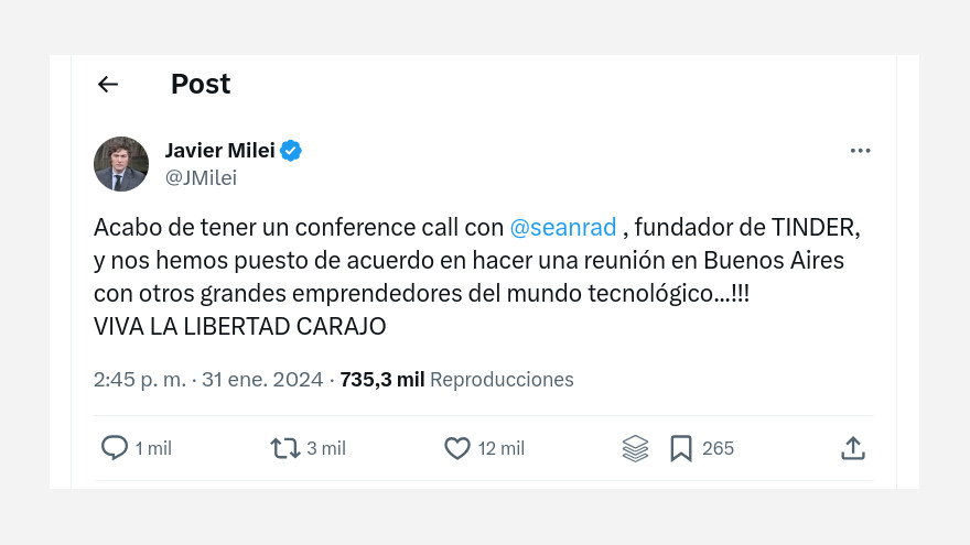 El presidente Javier Milei anunció en Twitter que habló con Sean Rad, creador de Tinder, la aplicación de citas más importante del momento, quien le prometió visitar la Argentina, al igual que Elon Musk.