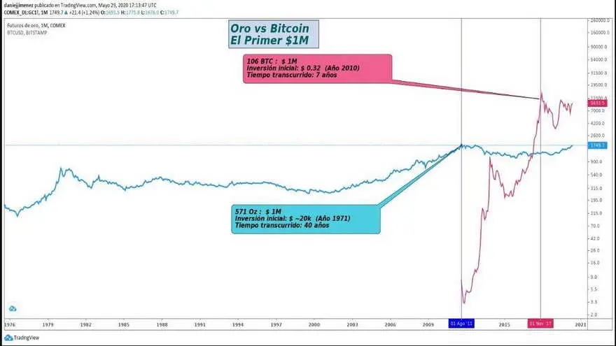Y no sólo fue más económico obtener el primer millón de dólares con Bitcoin, sino también más rápido y efectivo que los inversores de Oro en sus etapas iniciales de comercio, ya que solo bastaron siete años para alcanzar las siete cifras de retorno de inversión en BTC, en comparación con los 40 años del metal precioso.