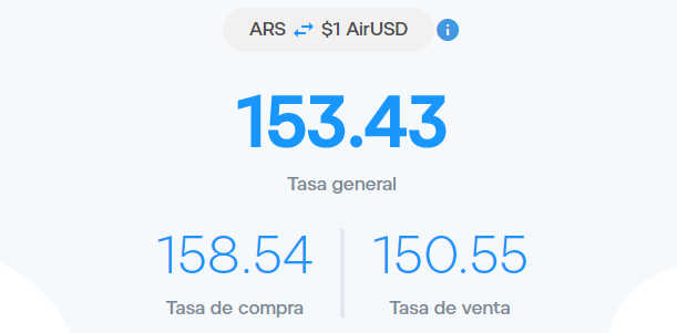 En Airtm rates, el AirUSD (stable ligada al precio de la divisa norteamericana) tenía a primera hora de la mañana un precio de compra de $158,54 y $150,55 para la venta.