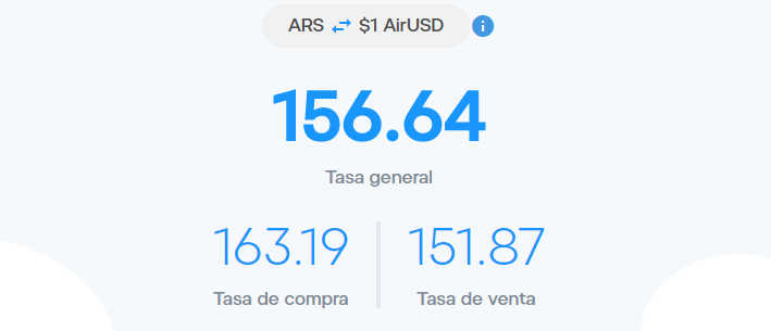En Airtm rates, el AirUSD (stable ligada al precio de la divisa norteamericana) tenía a primera hora de la mañana un precio de compra de $163,19 y $151,87 para la venta.