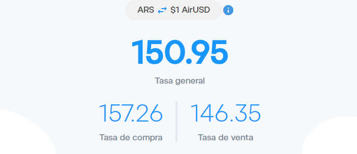 En Airtm rates, el AirUSD (stable ligada al precio de la divisa norteamericana) tenía a primera hora de la mañana un precio de compra de $157,26 y $146,35 para la venta.