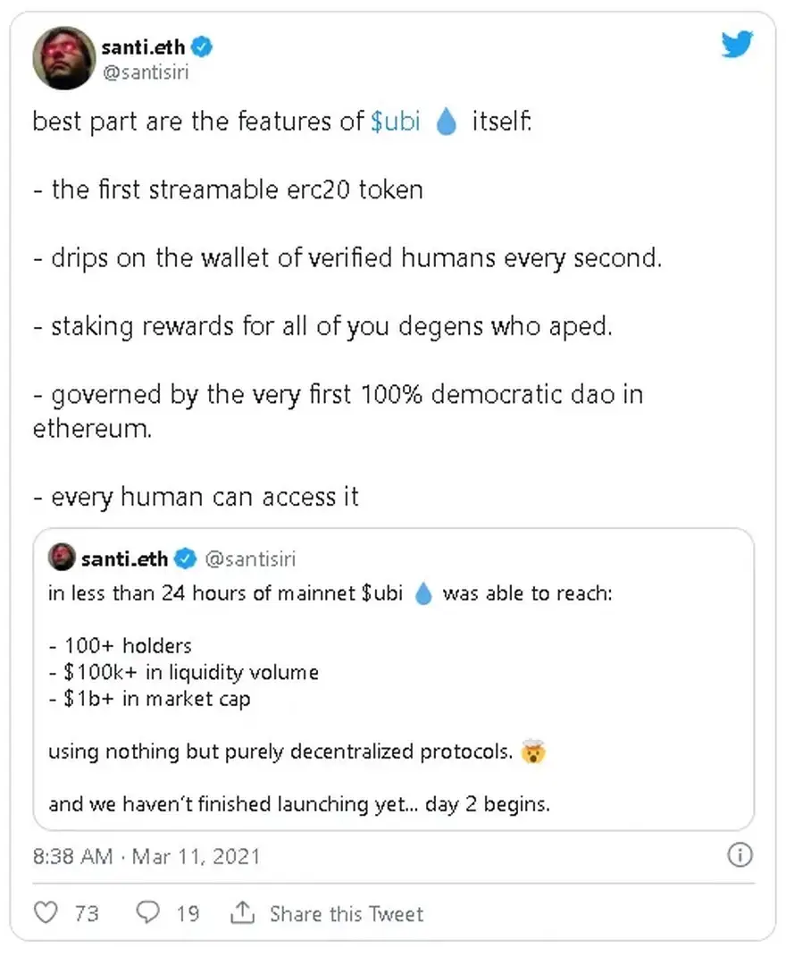 En un mensaje publicado en su cuenta en Twitter, Galperin confirmó su registro y aseguró que se trata de un "experimento personal". Varios de sus seguidores lo se emocionaron por la publicación del nuevo acercamiento del empresario al ecosistema de las criptomonedas. Hasta hubo otros que especularon al preguntarse si Mercado Libre comenzaría a aceptar $UBI pronto como medio de pago.