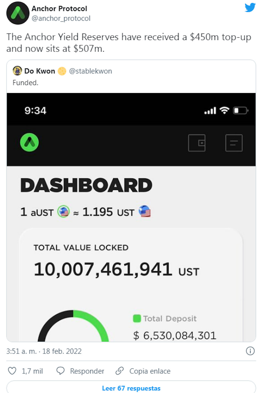 En Anchor también se pueden solicitar préstamos: los usuarios dejan depositados sus criptomonedas Luna o Ether como garantía y retiran UST por el 45% de su valuación, pero con un 15% de margen para liquidar. Es decir, si se depositaron Luna y baja 15%, automáticamente el protocolo liquida el colateral que fue depositado para hacerse, indicó Ámbito.