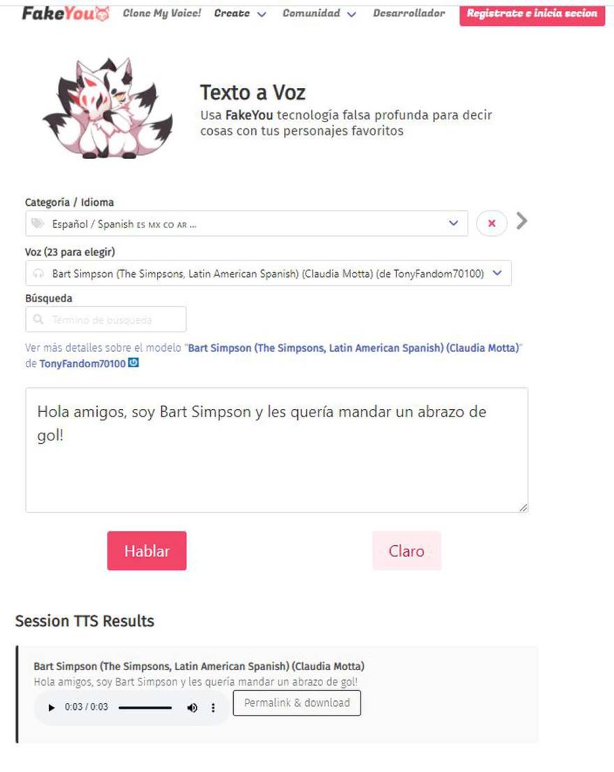 Todo se hace a través de una plataforma llamda FakeYou, que permite usar algunas voces latinas de estos personajes famosos, aunque el catálogo mucho más grande está en inglés.