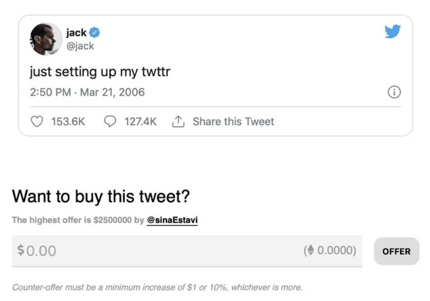 Tras darse a conocer la puja fallida, el NFT del primer tuit se volvió a poner a subasta y esta vez consiguió un poco más de atención en la subasta. Actualmente la máxima oferta de esta nueva puja trepó a los 2 ETH, unos 6,200 dólares. Una cantidad considerablemente mayor, pero todavía muy alejada de la enorme inversión que supuso la compra, según informó Clarín.