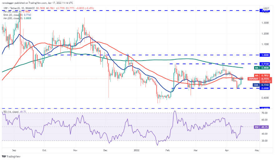 La EMA de 20 días plana y el RSI cerca del punto medio sugieren un equilibrio entre la oferta y la demanda. Este equilibrio cambiará a favor de los alcistas si el par XRP/USDT sube y rompe por encima de u$s0,80 por unidad. Eso podría impulsar al par a la SMA de 200 días (u$s0,88 por unidad) y luego a la importante resistencia de u$s0,91 por unidad.