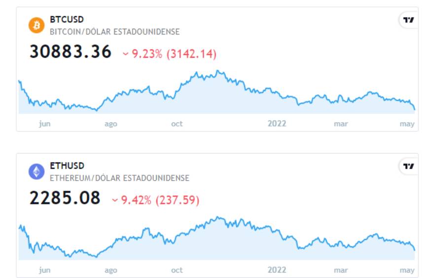 Las caídas se agravaron cuando este lunes 9 de mayo, cuando el Bitcoin (BTC) cayó 7%, por debajo de los u$s32.000 por unidad, y situó al mercado en un valor cercano a los u$s629.000 millones, lejos de los u$s1,27 mil millones, máximo histórico registrado en noviembre de 2022. Sólo la caída de la última semana alcanza el 18%.