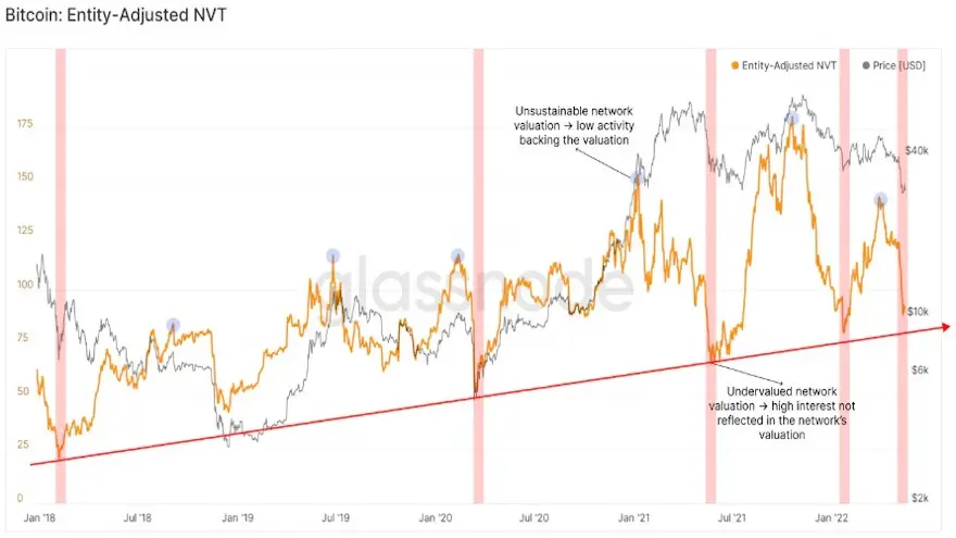 Una es que Bitcoin comenzó 2022 en u$s 46.200, mientras que la media móvil exponencial de casco de 180 semanas, indica que el momento para BTC está disminuyendo y actualmente se ubica en u$s 47.166.