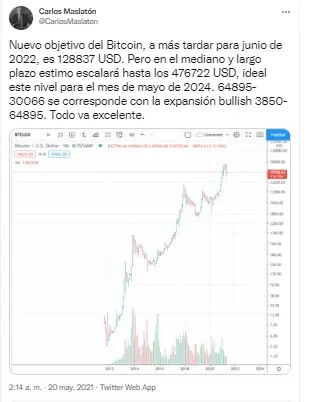 En su momento había declarado en un tuit: "Nuevo objetivo del Bitcoin, a más tardar para junio de 2022, es 128837 USD. Pero en el mediano y largo plazo estimo escalará hasta los 476722 USD, ideal este nivel para el mes de mayo de 2024. 64895-30066 se corresponde con la expansión bullish 3850-64895. Todo va excelente".