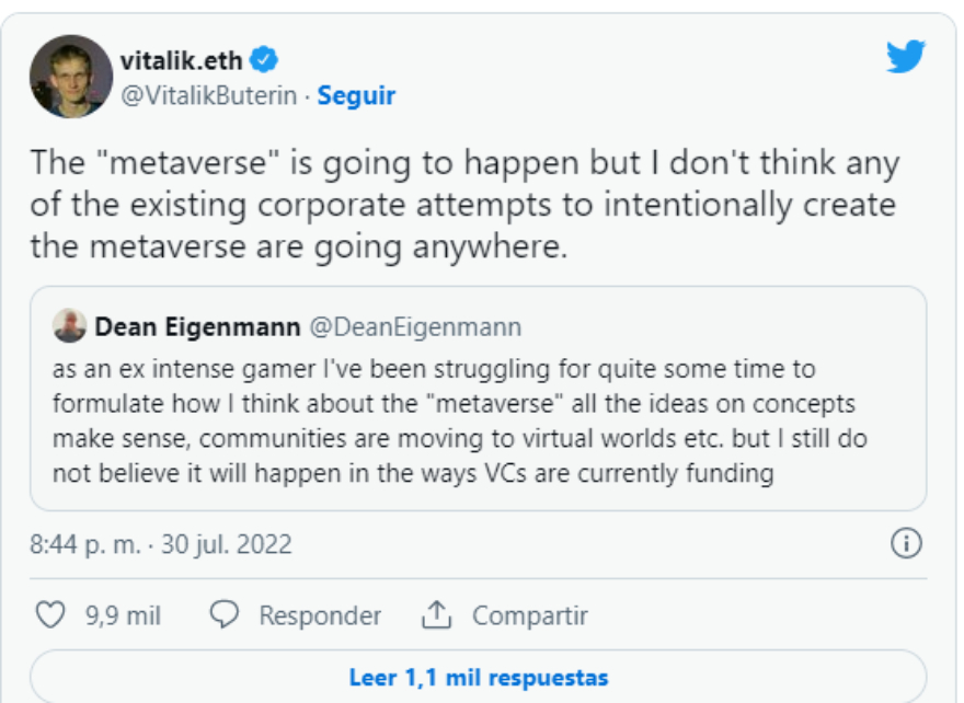 Los comentarios de Buterin se producen a pesar de que recientemente se pusieron en marcha varios proyectos de metaversos exitosos como Decentraland y The Sandbox.