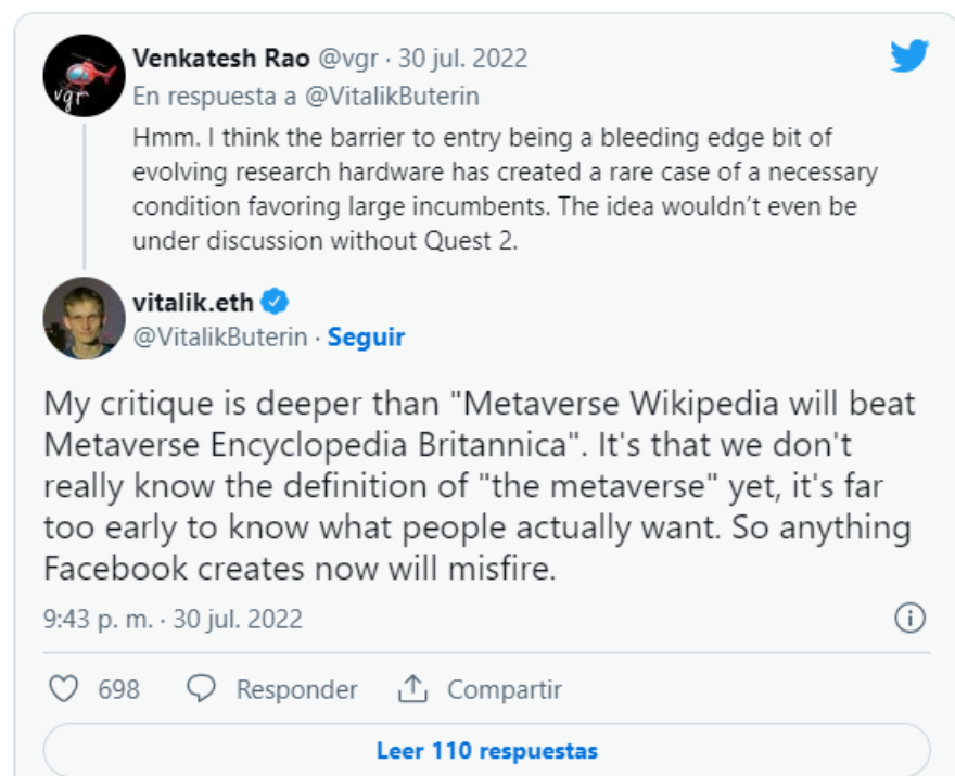 Según Buterin, su "crítica es más profunda que ‘la Wikipedia del metaverso vencerá a la Enciclopedia Británica del metaverso’.