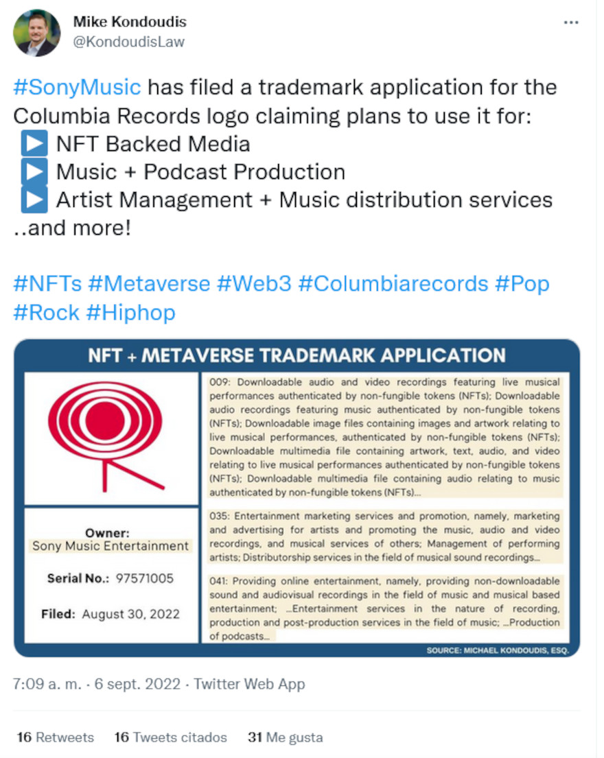 Ahora fue el turno de Sony Music, que quiere registrar una marca para música autentificada por NFT.