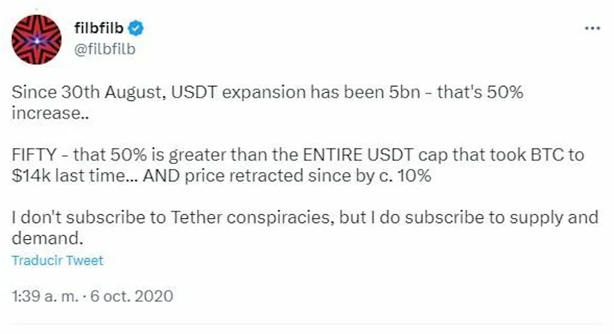 "No me suscribo a las conspiraciones de Tether, pero me suscribo a la oferta y la demanda", tuiteó en 2020 el fundador de Decentrader y conocido comerciante de criptomonedas filbfilb.
