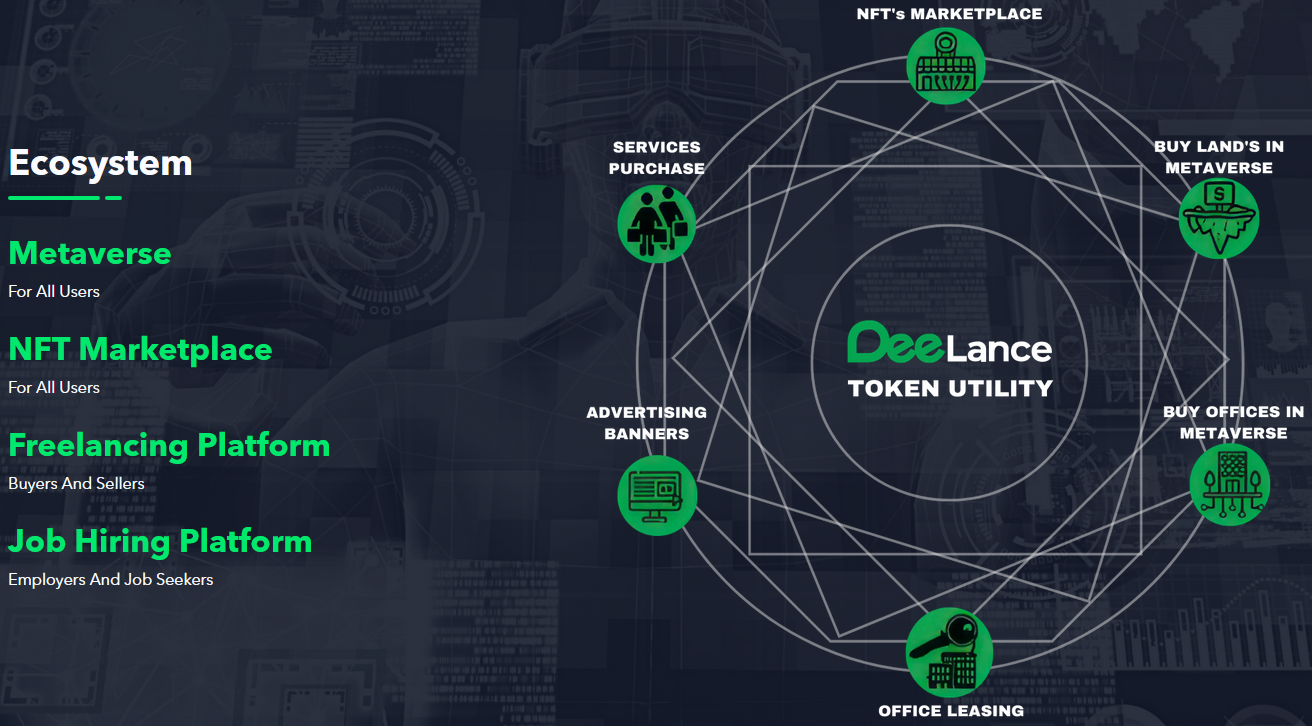 El ecosistema DeeLance incorpora un metaverso, un mercado NFT y una plataforma de contratación de autónomos y empleo, que forman los tres pilares de un sistema interactivo sin fisuras.