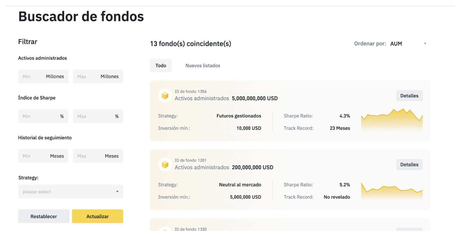 La plataforma es un servicio gratuito y Binance no interviene en las discusiones ni en ninguna ejecución entre inversores y gestores de inversiones. Cualquier transacción posterior entre los participantes es independiente de la plataforma. Más de 20 fondos de inversión ya han sido listados en el lanzamiento de esta plataforma y Binance continuará introduciendo nuevos.