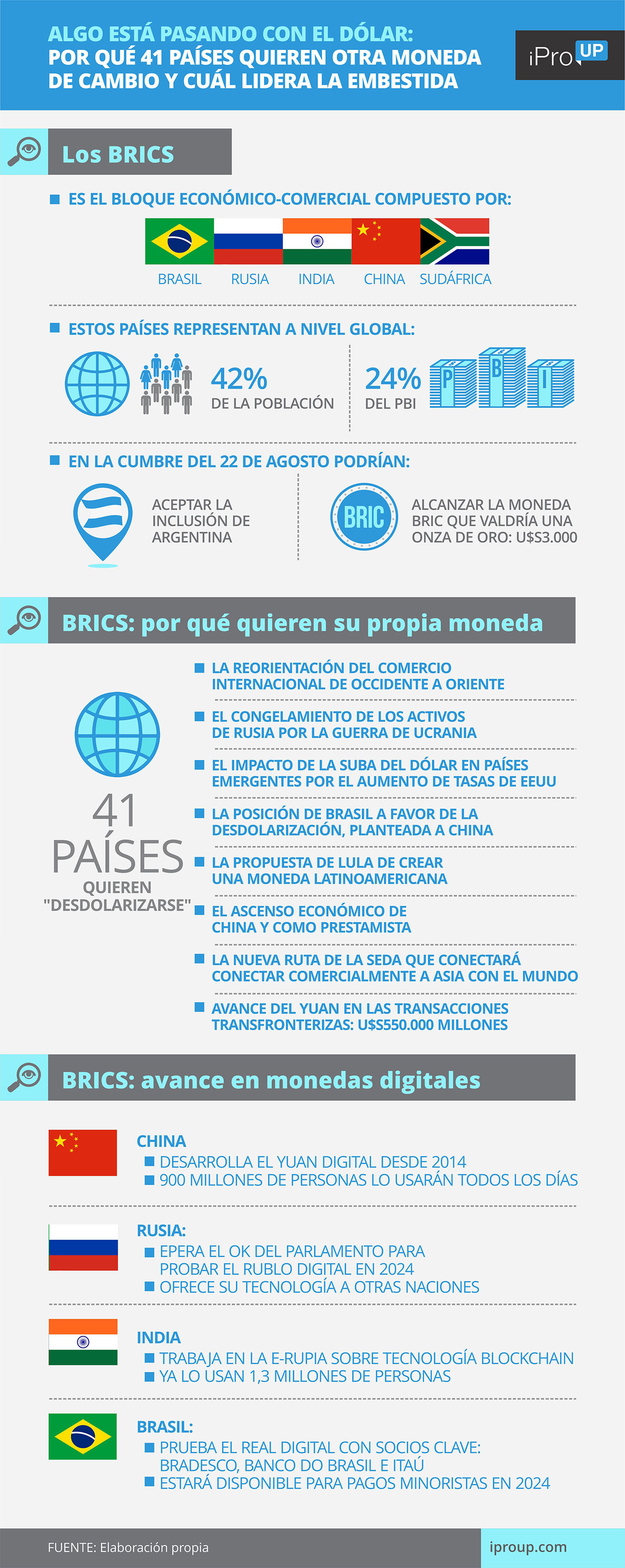 Patricio Giusto, director del Observatorio Sino-Argentino, señala a iProUP que el BRICS comenzó como una plataforma de cooperación, en comercio e inversiones, para grandes economías emergentes, pero también otras más pequeñas como Argentina, México, Arabia Saudita e Indonesia. Ahora, buscan proponer una opción al sistema monetario internacional.