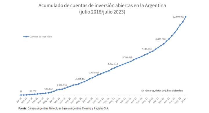 En los últimos cuatro años, la cantidad de cuentas de inversión abiertas creció 20 veces en la Argentina: se pasó de casi 630 mil cuentas en julio de 2019 a 12,8 millones en julio de 2023, de las cuales 4 millones se crearon en 2023, según información de la cámara compensadora Argentina Clearing y Registro. S.A. (Acyrsa), ente de registro de operaciones entre Fondos Comunes y billeteras virtuales.