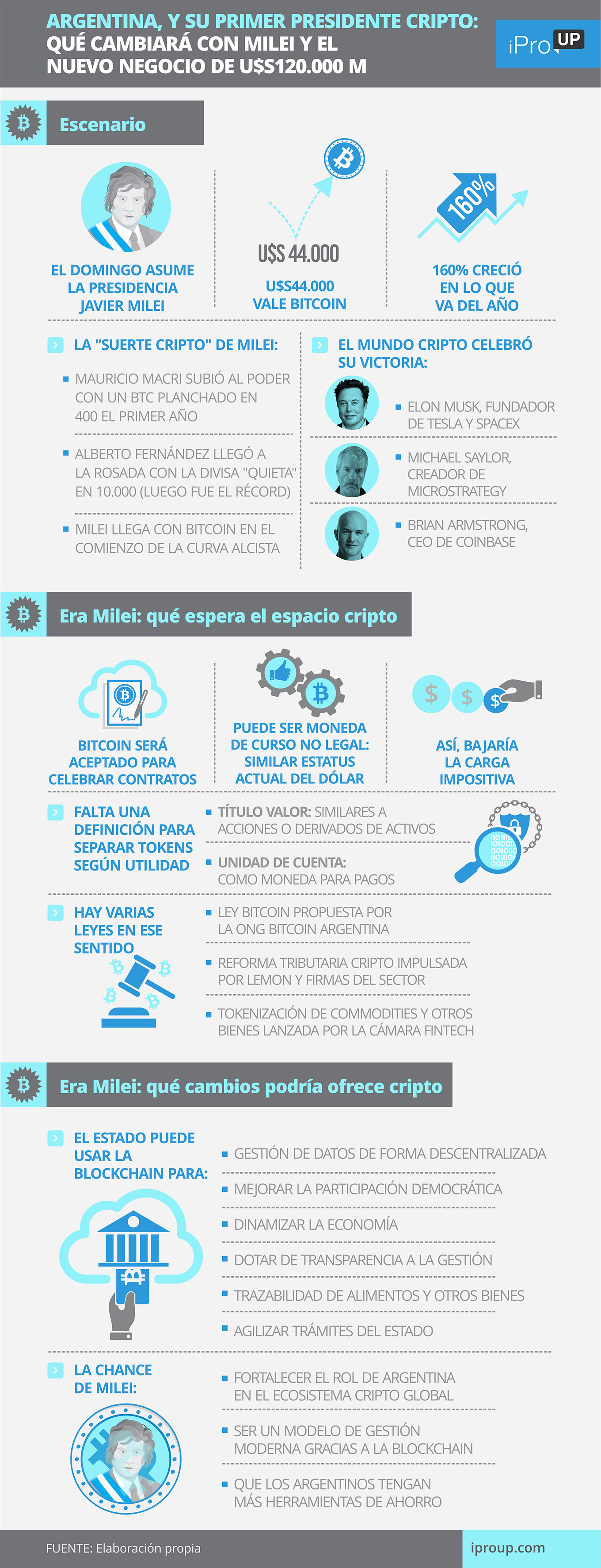 Javier Mateos, profesional independiente en materia cripto, asegura a iProUP que los antecedentes de Milei "hacen pensar en una potencial inclusión como moneda legal". Todo parece indicar que el presidente electo dará un espaldarazo a las divisas digitales.