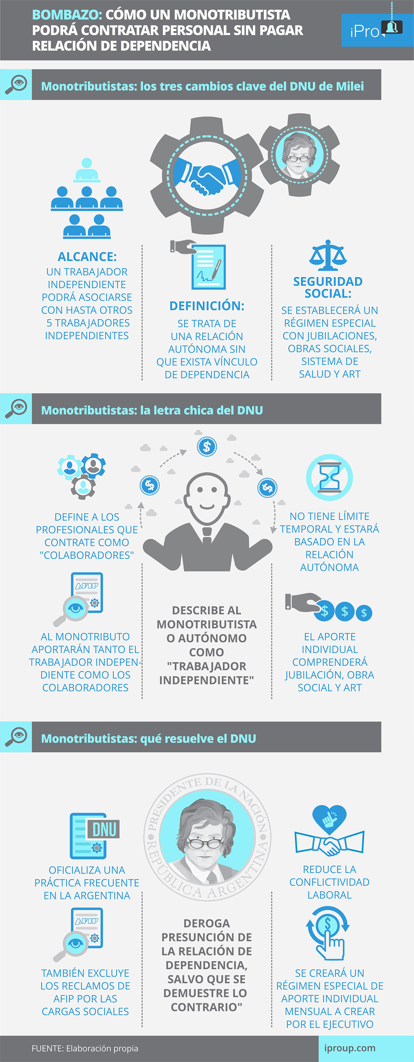 Ahora, este DNU parece haber tomado la experiencia de estos freelancers, ya que crea la figura de los "colaboradores" de monotributistas o autónomos que trabajen como independientes y, a su vez, contraten a otros independientes. Y determina que no existirá entre ellos la relación de depedencia.