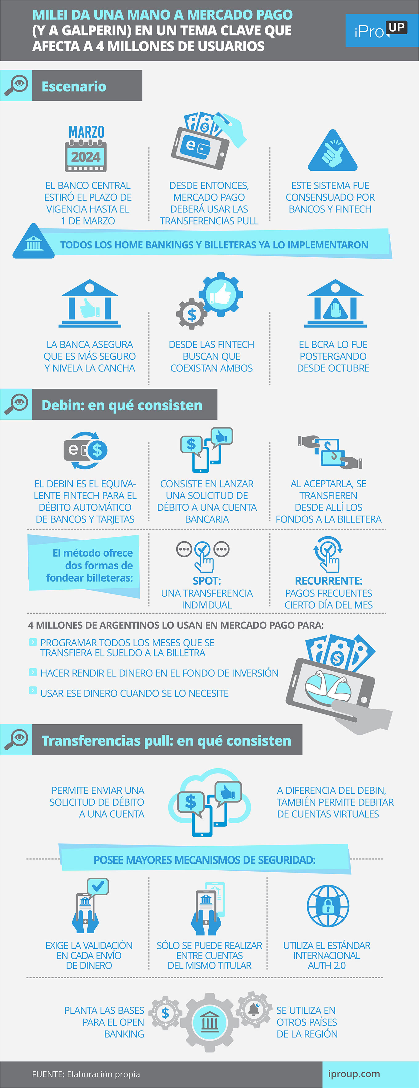 Mercado Pago se opuso con fuerza a este cambio y pidió que convivan los dos sistemas. EL BCRA había resuelto que los usuarios nuevos usen transferencias pull desde enero y que en marzo todas las cuentas que hoy ingresan dinero mediante Debin vuelvan a enrolarse en la app. Ahora, determinó que ambos plazos pasen al 1° de marzo.