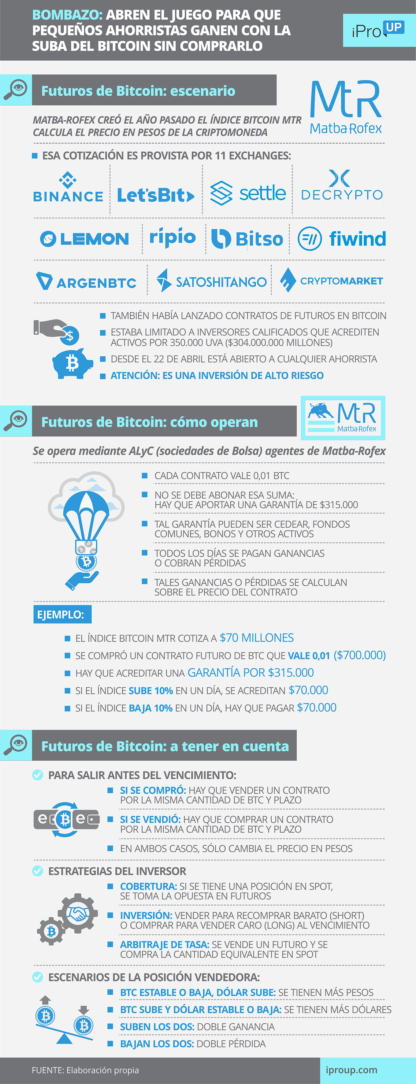 En este caso, advierte, ni siquiera el subyacente es la criptomoneda, sino su precio en pesos. O, más específicamente, el Índice Bitcoin MtR, consistente en el promedio de las cotizaciones locales. Así, los futuros de Bitcoin funcionan de la siguiente forma: