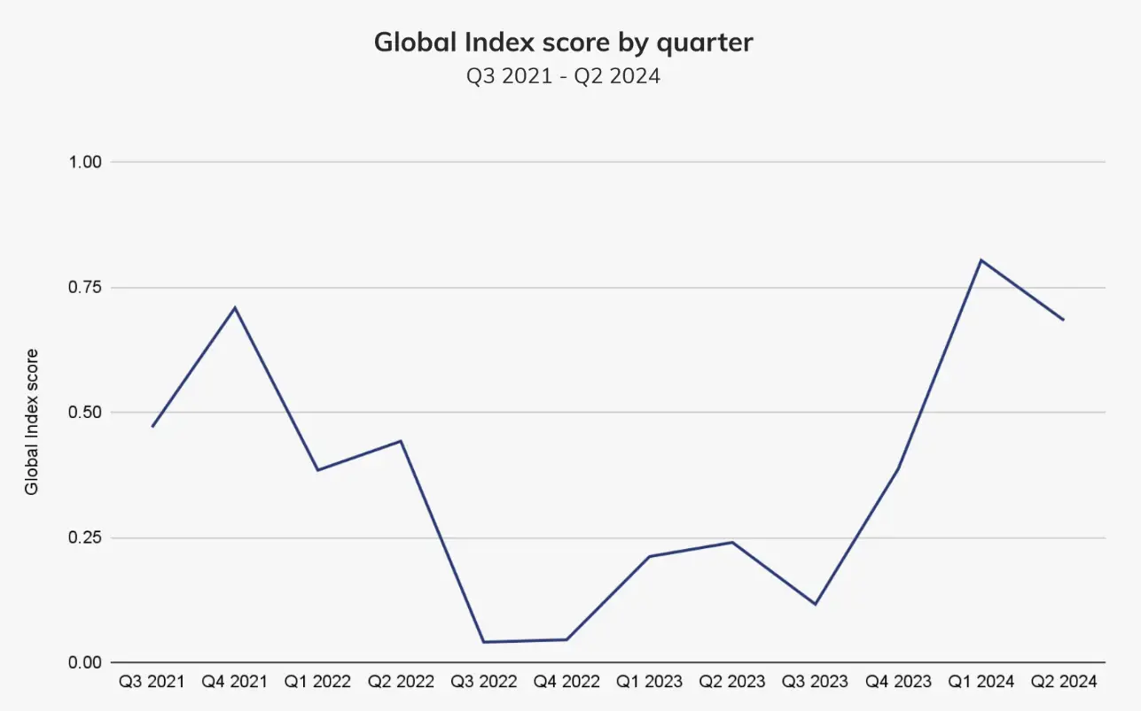 El informe más reciente indica que entre el cuarto trimestre de 2023 y el primer trimestre de 2024, la criptoactividad mundial ha registrado un notable incremento, superando los niveles observados durante el mercado alcista de 2021.