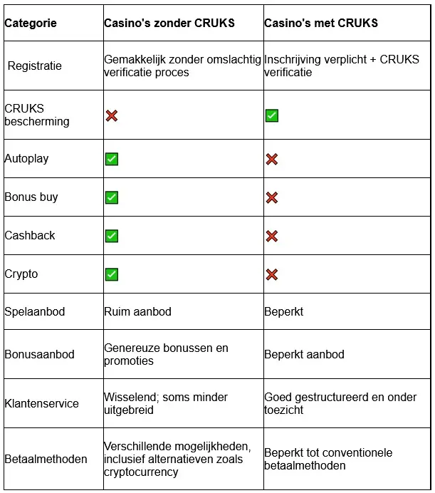 Er zijn een aantal duidelijke verschillen tussen casino's zonder CRUKS en casino's met CRUKS. In de onderstaande vergelijkingstabel kun je snel en eenvoudig zien wat deze verschillen zijn. Zo kom je razendsnel te weten welke optie het beste bij jouw speelstijl en voorkeuren past.