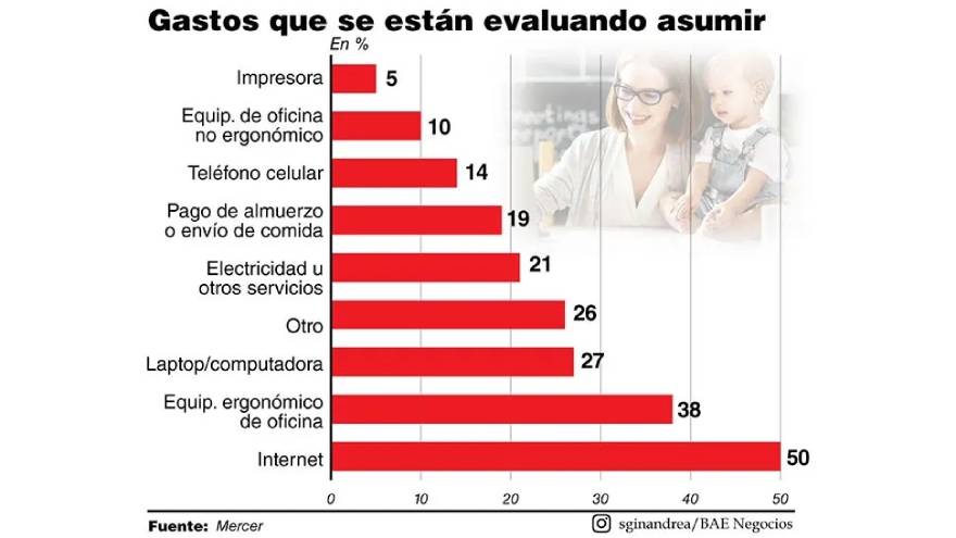 Sobre los cálculos de costos laborales y su incremento pandémico, siempre a tono con la vigencia de la la ley de Teletrabajo, las empresas están evaluando asumir el pago de la conexión a internet (50%), equipamiento ergonómico de oficina (38%), adquisición de laptop (27%), así como abonar gastos de electricidad y otros servicios (21%). "No obstante, el 69% no ha decidido como implementará el pago; el 18% otorgará un monto fijo para todo el personal que efectúe teletrabajo; el 9% implementará un reintegro contra presentación de factura del gasto".