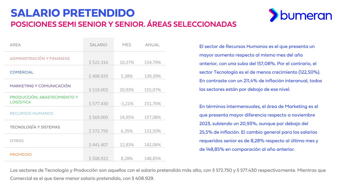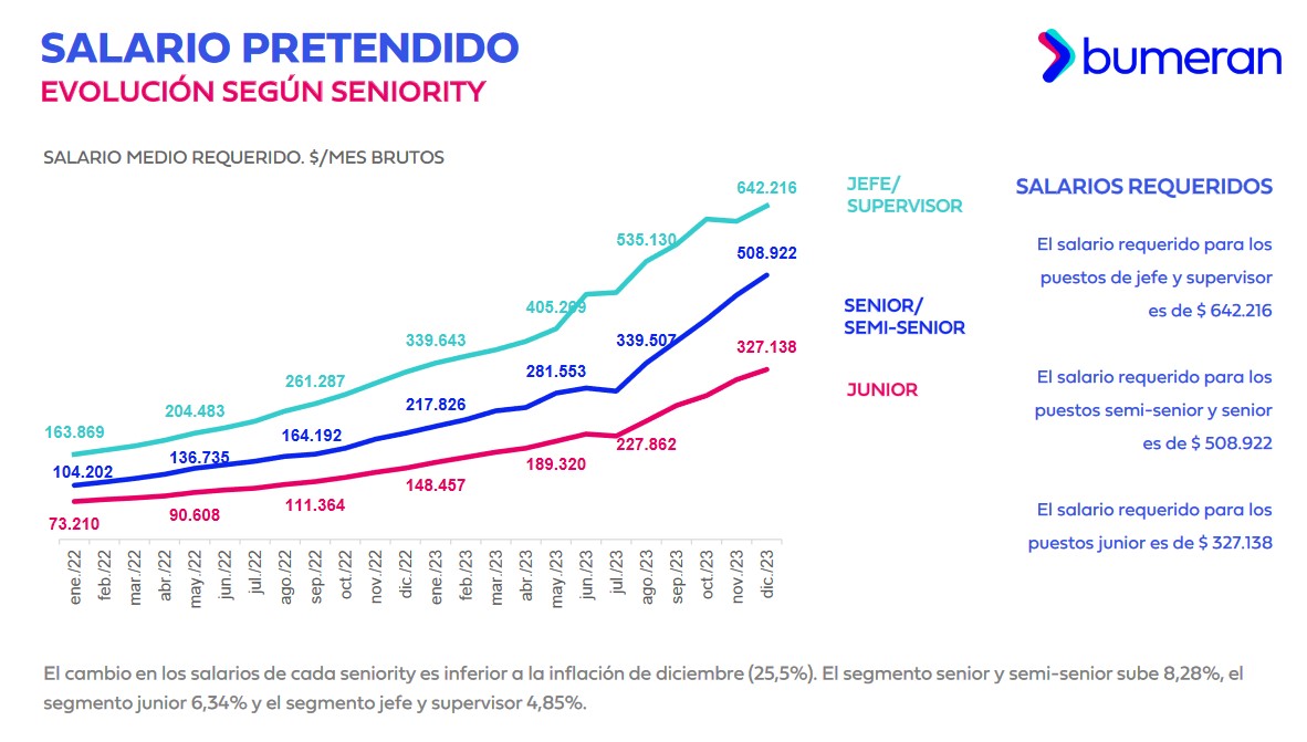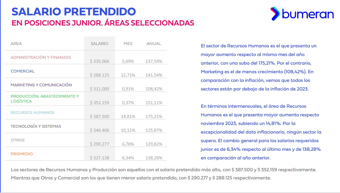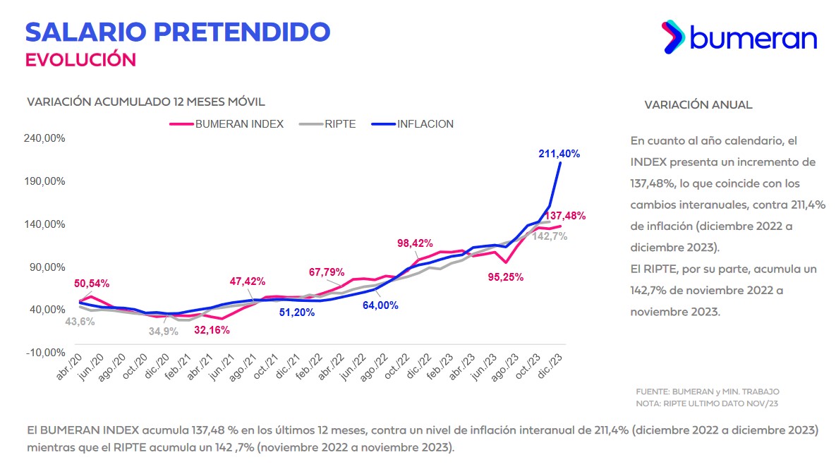 En un 2023 donde la economía argentina experimentó turbulencias, el Index del Mercado Laboral de Bumeran reveló que los salarios requeridos de enero a diciembre ascendieron a un récord del 137,48%.