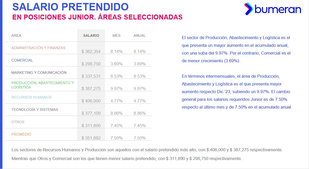 Este segmento es liderado por Recursos Humanos ($406.000), que muestra una suba de 4,77% respecto al mes anterior y está 15 puntos porcentuales por encima del promedio general junior del mercado, que es de $351.682 por mes.
