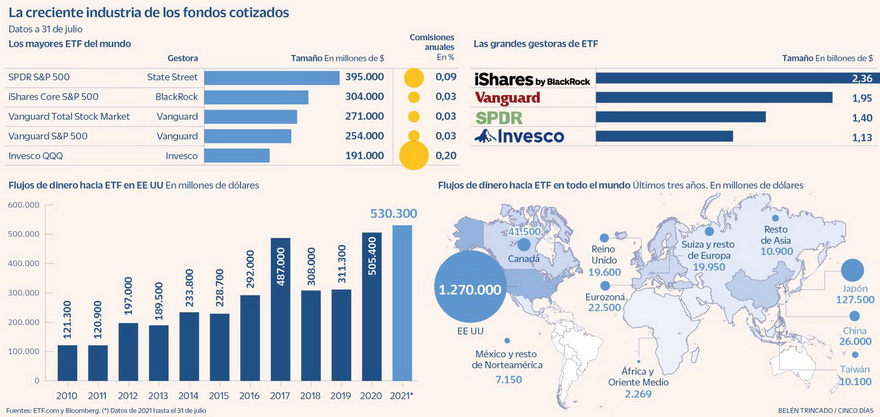 Desde hace 20 años, las gestoras de inversión tradicionales han empezado a ver las orejas al lobo. La todopoderosa BlackRock, la mayor firma de gestión de activos del mundo, con 9,5 billones de dólares, decidió adquirir iShares en 2009, la filial de ETF de Barclays, para plantar cara a Vanguard y State Street. Hoy, esta división gestiona casi tres billones de euros, un tercio del total de activos del grupo. El grupo Fidelity o JP Morgan también ha desarrollado potentes filiales de fondos cotizados.