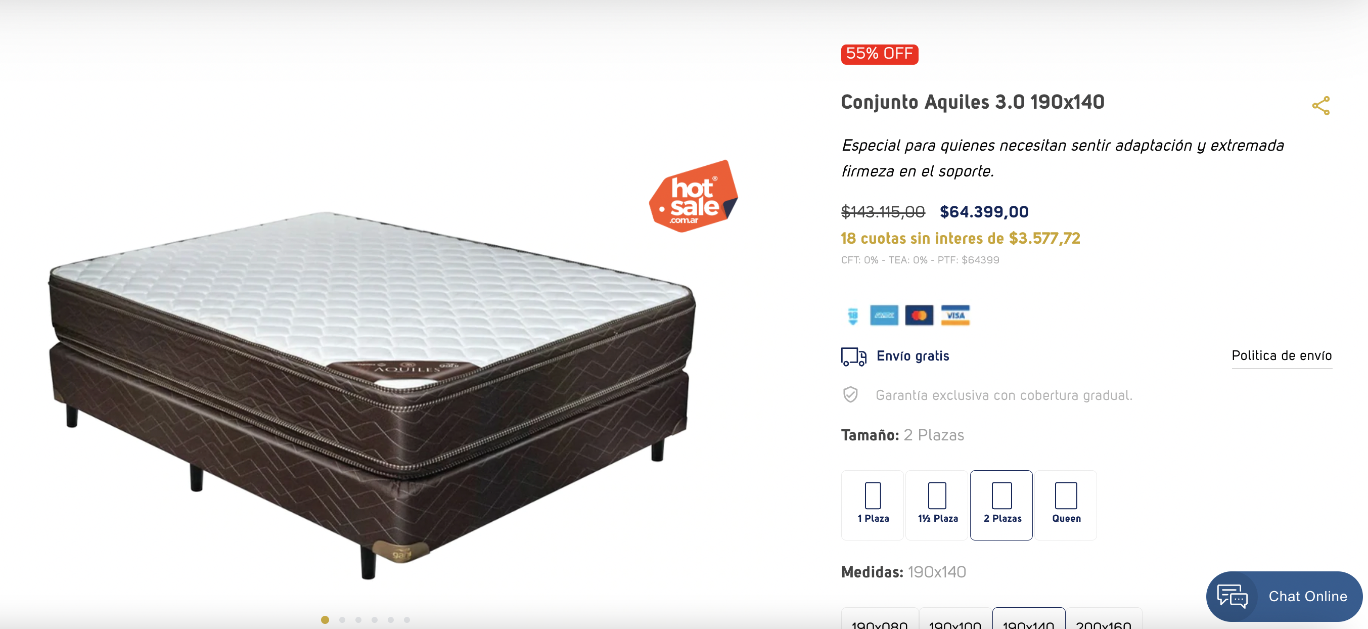 - Conjunto Aquiles 3.0 190x140, precio habitual $143.115,00, precio de oferta $64.399,00 y 18 cuotas sin interes de $3.577,72.