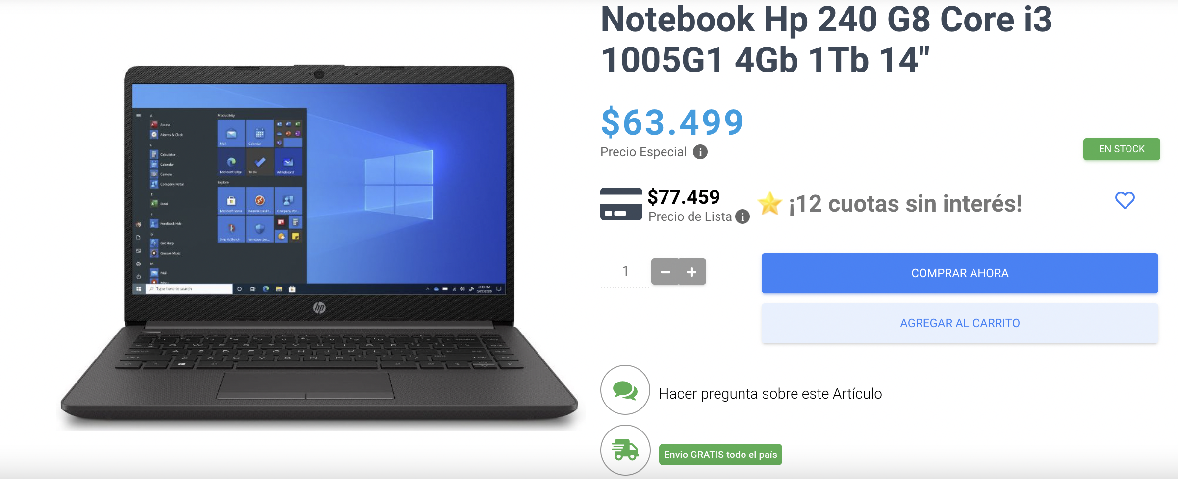 - Notebook Hp 240 G8 Core i3 1005G1 4Gb 1Tb 14", $63.499 precio especial, $77.459 precio de lista, y 12 cuotas sin interés.