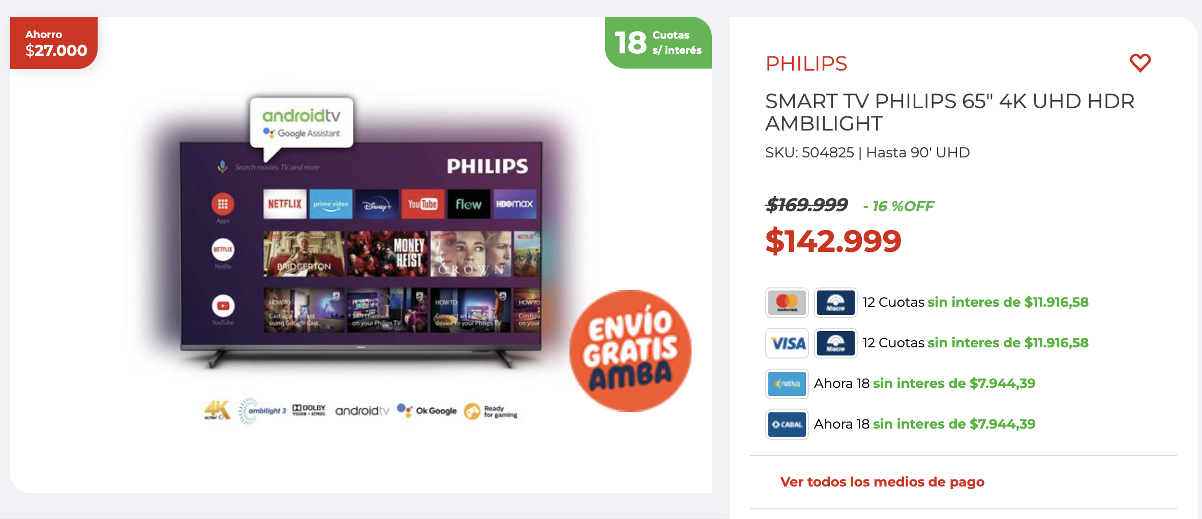 - SMART TV PHILIPS 65" 4K UHD HDR AMBILIGHT, antes $169.999, y ahora con un 16 %OFF queda en $142.999.