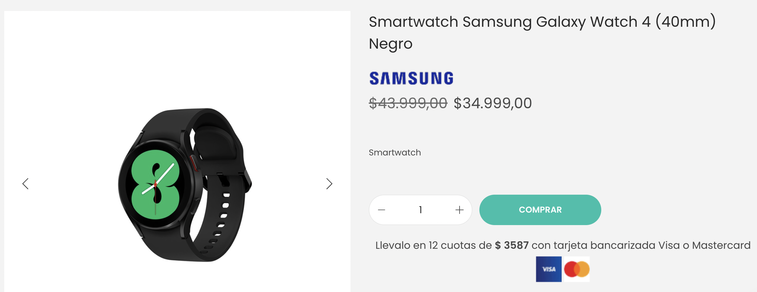 - Smartwatch Samsung Galaxy Watch 4 (40mm) Negro. Antres: $43.999,00. Ahora: $34.999,00.