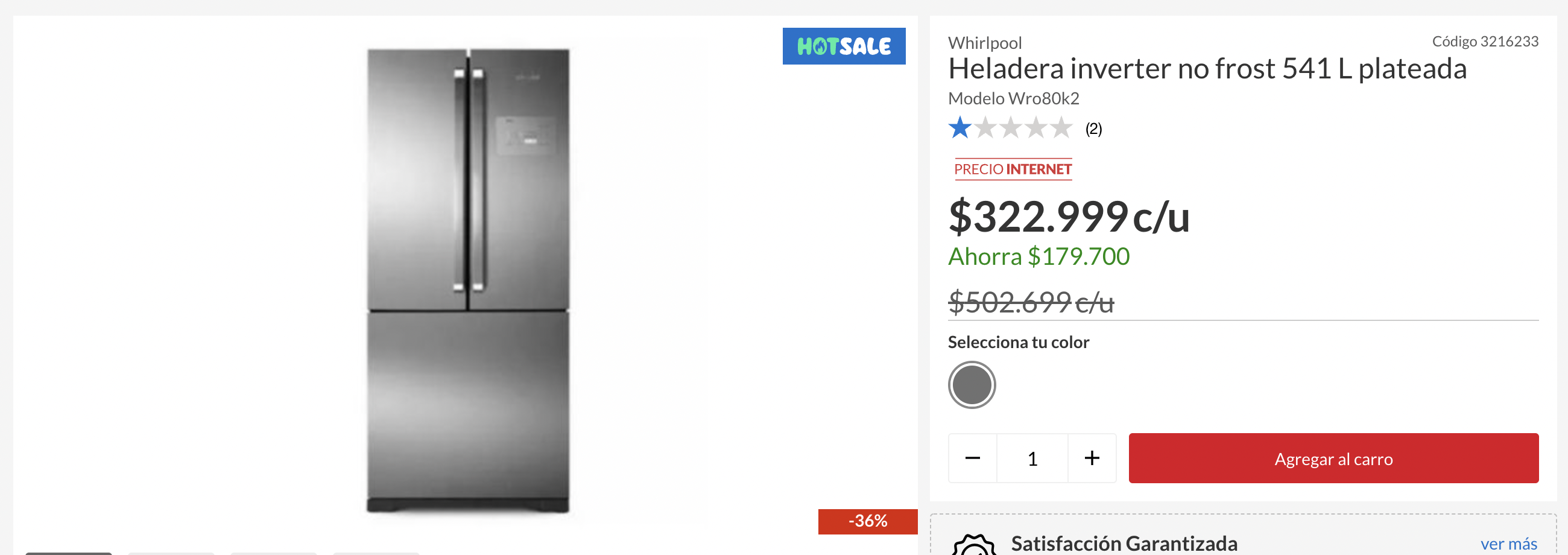 - Whirlpool Heladera inverter no frost 541 L plateada Modelo Wro80k2, precio especial $322.999, y precio original $502.699