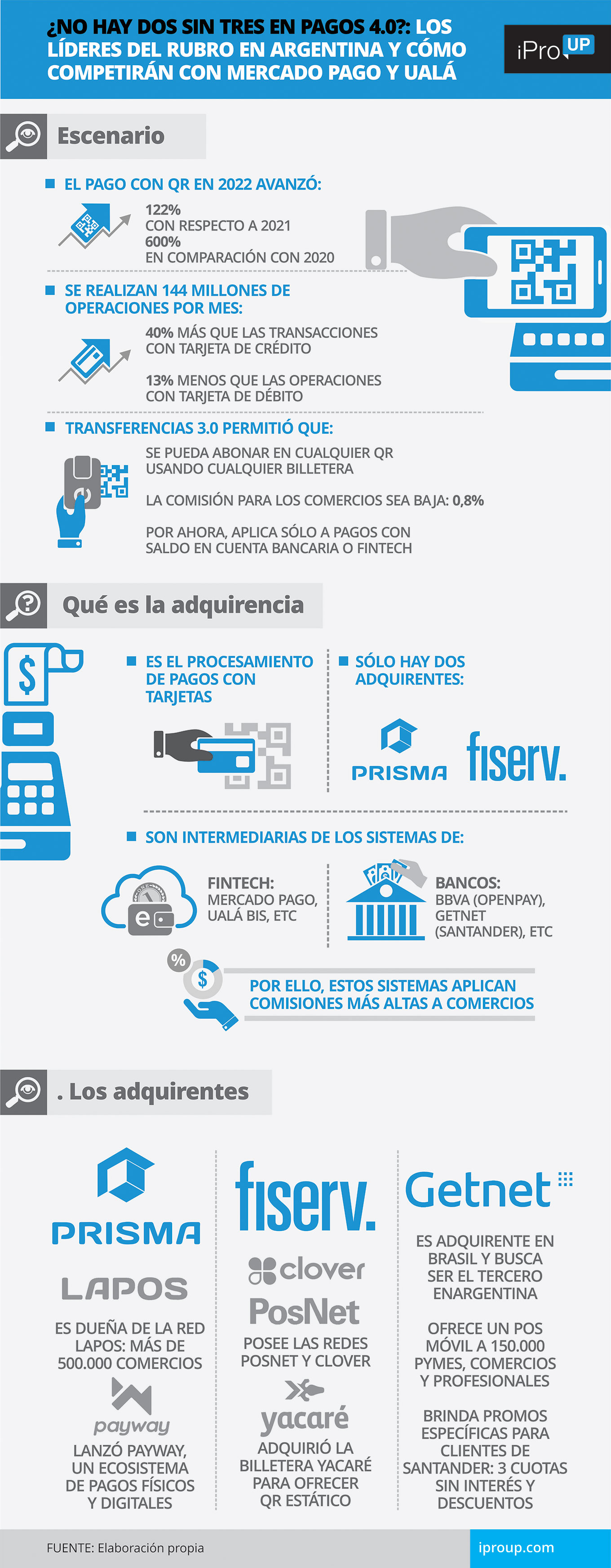Las únicas dos únicas adquierentes en el país son Fiserv y Prisma, que actúan como intermediarias de las propuestas de las fintech, como Mercado Pago, Ualá Bis, y los bancos Galicia (Naranja X), BBVA (Openpay) o Santander (Getnet), entre otros.