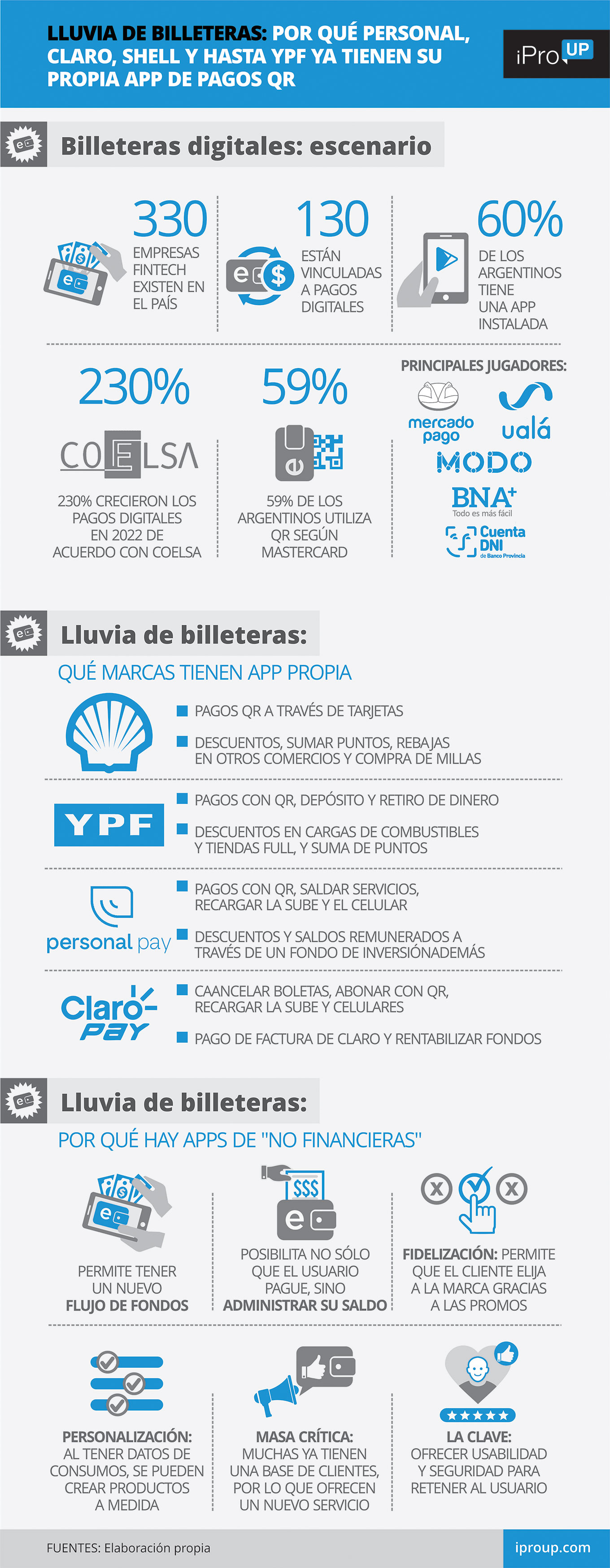 Además, remarca que "el contexto implica que, mientras no todas las billeteras subsisten, aparecen otras vinculadas a negocios y empresas específicas: las apps de YPF, Shell, Personal Pay y, en el sector del campo, Agripay y Agrofy Pay".