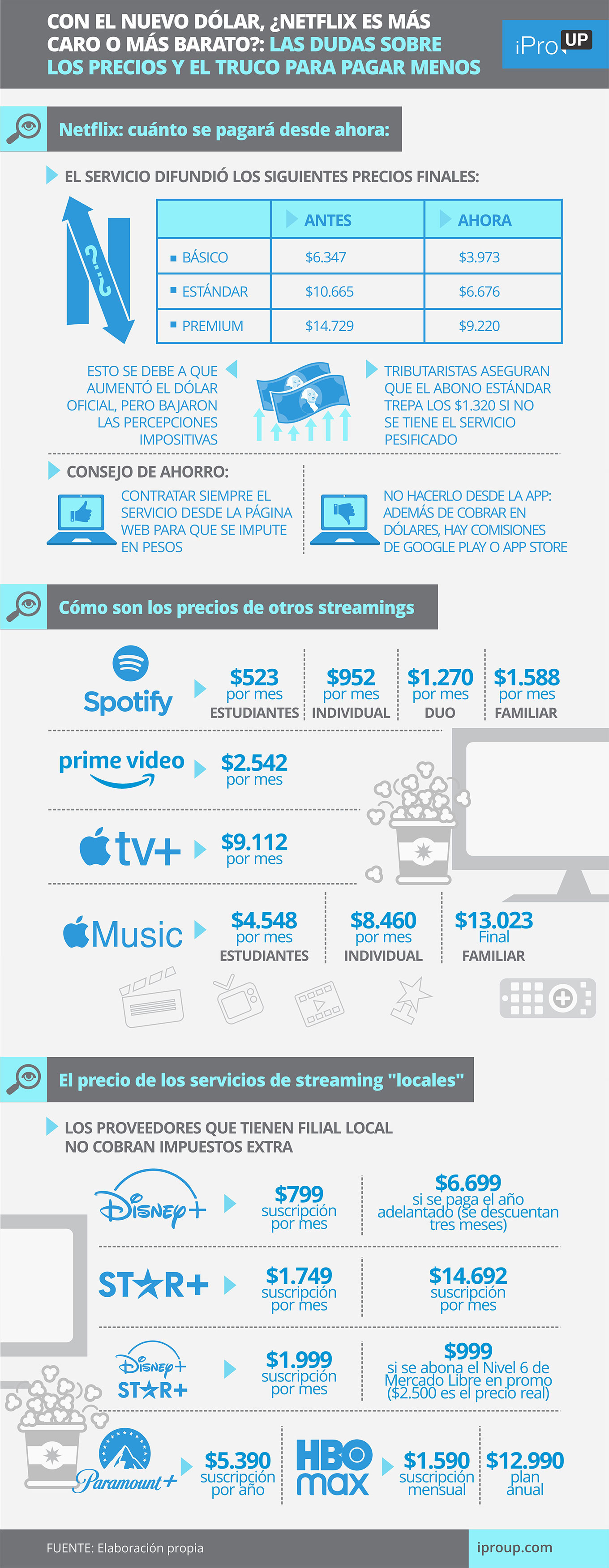 Sin embargo, así como el dólar oficial aumentó más del doble, el ministro anunció una reducción impositiva que también juega en la conformación del precio final del abono. Así las cosas, la pregunta del millón es: ¿cuánto más tendremos que pagar por Spotify, Netflix, HBO o Prime Video?