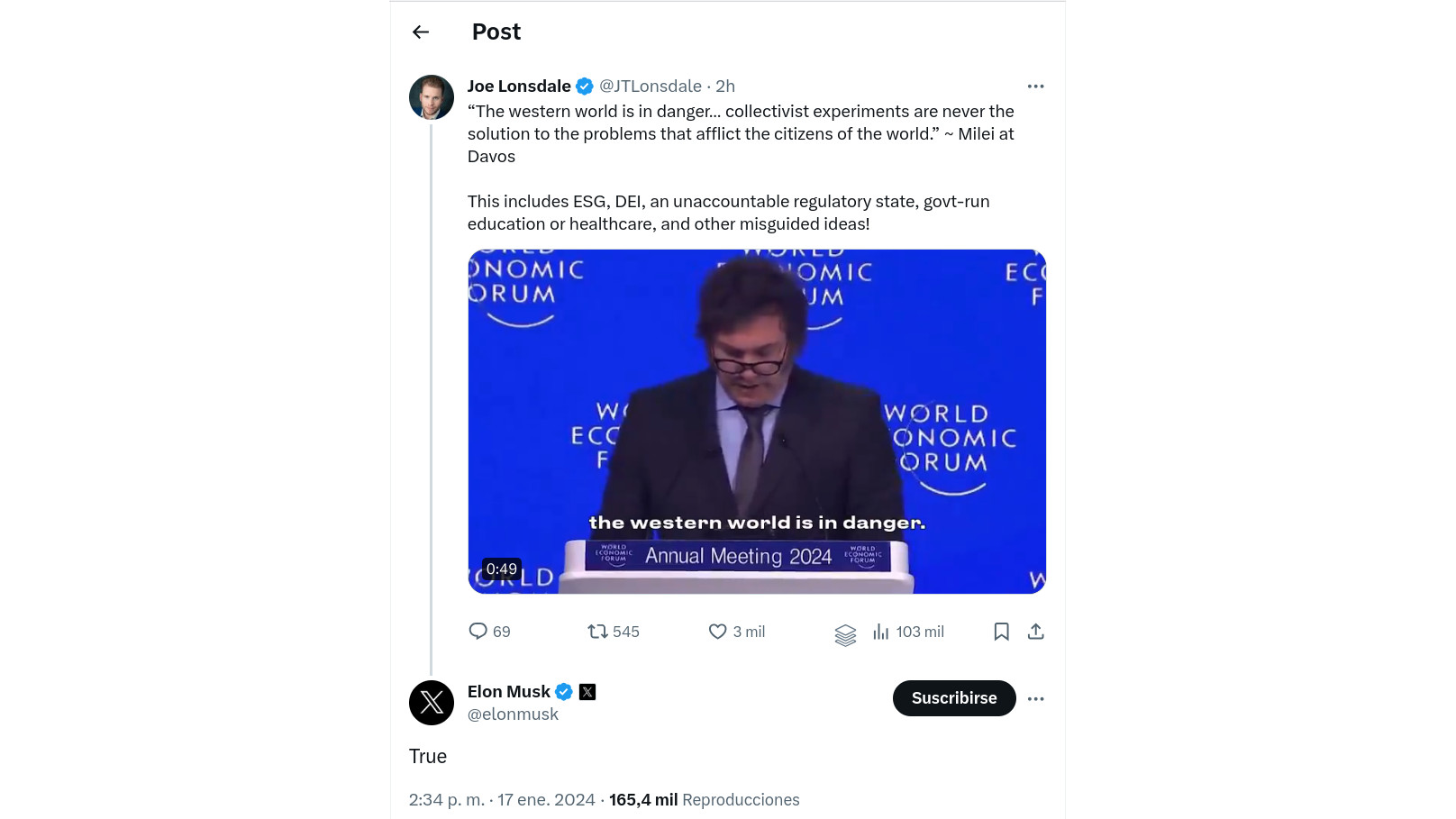 El presidente Javier Milei se presentó este miércoles 17 de enero en el Foro Económico Mundial, que se realiza en Davos (Suiza), y muchos fragmentos de su ponencia fueron compartidos en la red social X. Uno de ellos fue resaltado por Elon Musk, quien mantiene una relación fluida con el mandatario argentino.