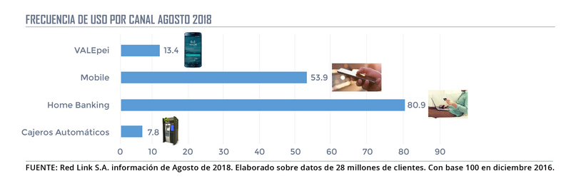 En total, se estiman unas 355 millones de transacciones realizadas en agosto de 2018. De este número, el 47% fue concretado por home banking y mobile se quedó con el 23%. El restante 30% se distribuye entre los cajeros automáticos.
