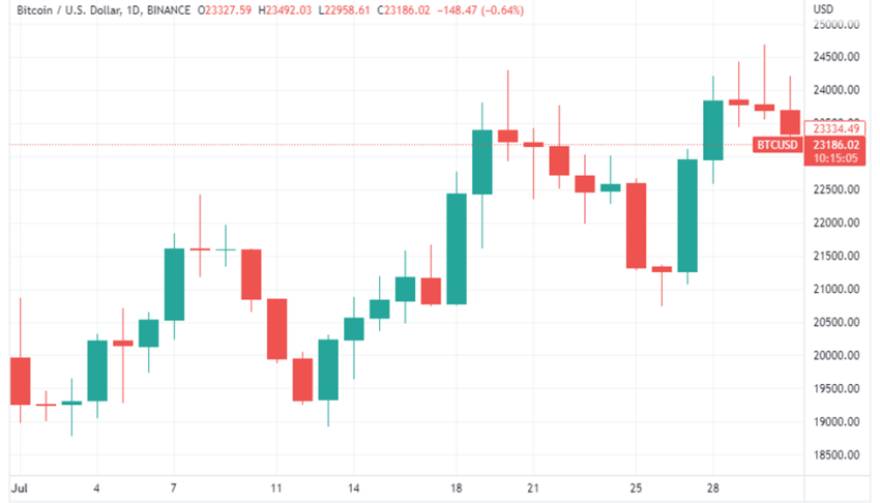 En julio, Bitcoin se negoció en el rango de precios entre u$s18,967 por unidad y u$s24.573 cada uno.