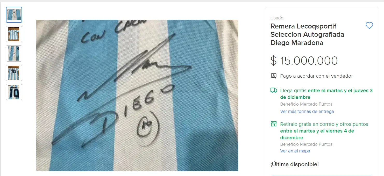 Otro vendedor fue un poco más exigente: pidió nada más y nada menos que $15.000.000 por una camiseta firmada por el ídolo recientemente fallecido. En la descripción contó que "en el año 2013, tuve el placer de compartir una cena multitudinaria con el Diego en Dubai. Muchos le pedían fotos, otros los tocaban, yo elegí regalarle un billete con la cara de Evita, para que tenga algún nuestro en la lejanía. Me pidio la dirección y como 7 años después, se ve que encontró el billete en algún lado... me llega esta espectacular remera, nueva, firmada y dedicada. Hoy con el alma en el piso decido venderla para poder mudarme". Los comentarios a la publicación son casi todos irónicos respecto del precio de la camiseta.