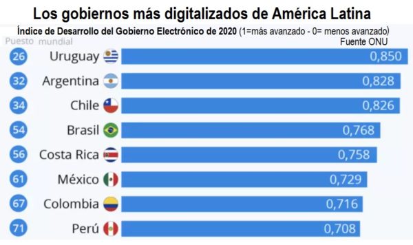 De los países latinoamericanos incluidos en el estudio, Uruguay obtuvo la más alta puntuación con un índice de 0,85 en una escala de cero a uno. En el escalograma, que va de cero a uno, uno equivale al mejor desempeño posible en cuanto al desenvolvimiento de lo electrónico en el gobierno .