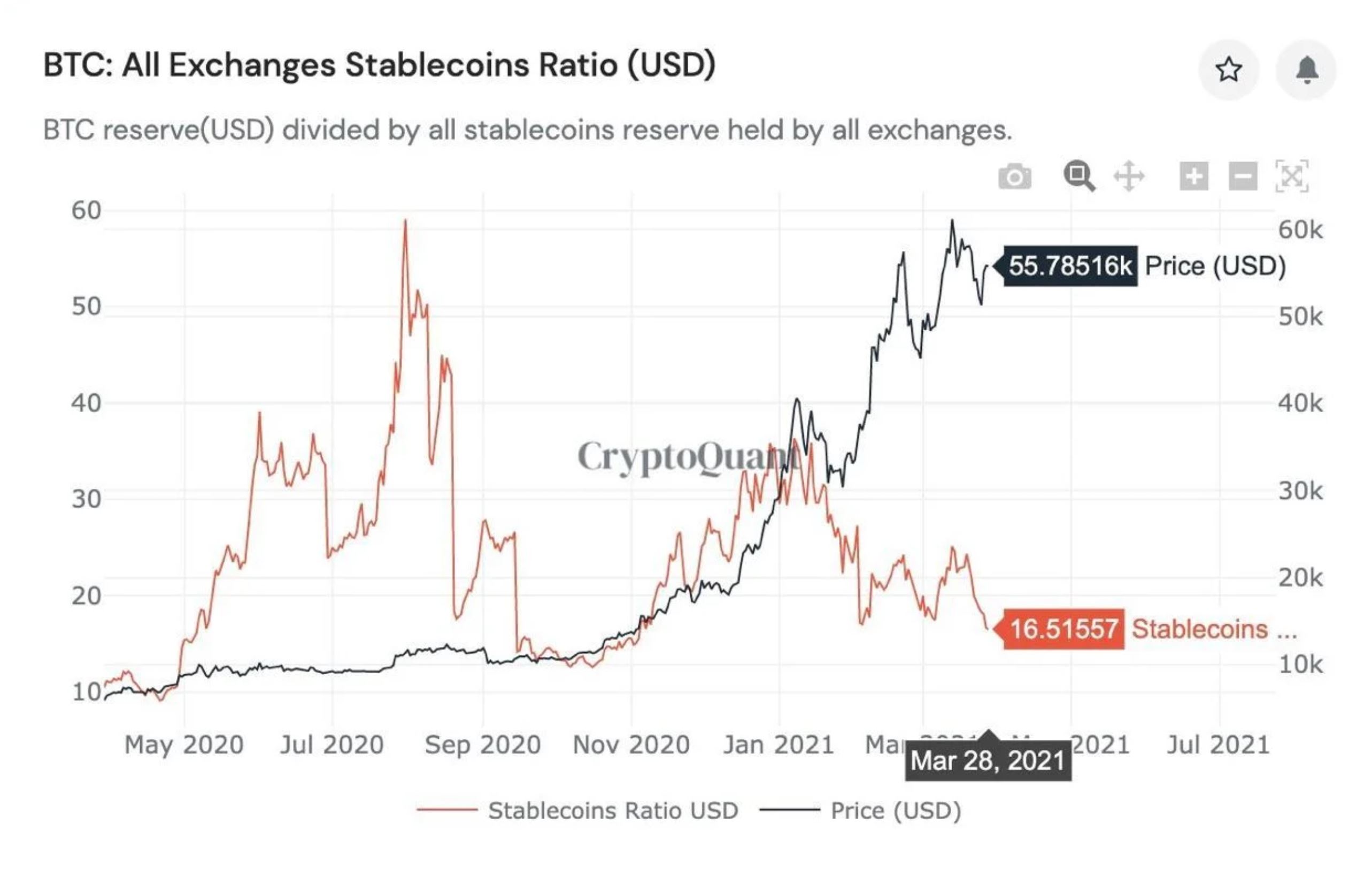 Algunos indicadores importantes que apuntan a más ventajas son el crecimiento de las monedas estables y la cantidad de monedas estables en relación con el BTC que se mantienen en los exchanges.
