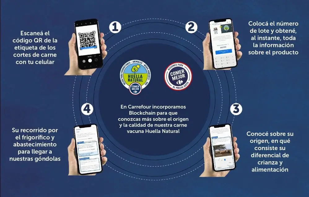 "Esta tecnología facilitará a nuestros clientes el acceso a la información sobre la procedencia de los productos Huella Natural", manifestaron fuentes del comercio de origen francés, quienes agregaron que dentro de los 16 cortes de carne vacuna de origen nacional incluidos en este lanzamiento se encuentran los clásicos bife americano, bife de chorizo, colita de cuadril, entraña, lomo, matambre, ojo de bife, peceto, roast beef y tapa de asado.